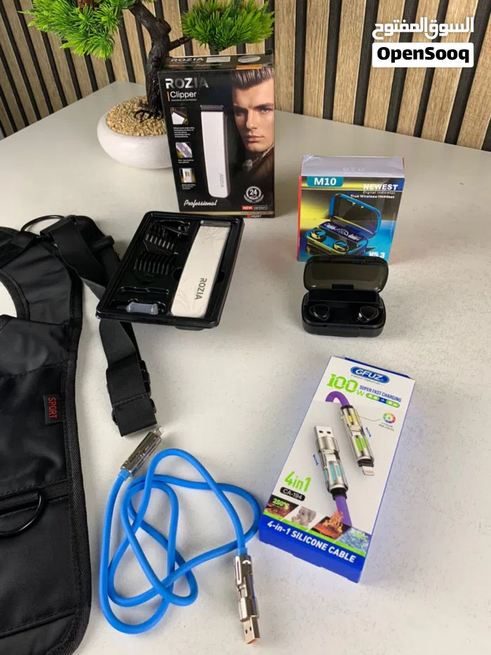 كاين وحد النوع تاع المنتجات لي ماشي غير “كمالية”، بصح تولّي تستعملهم كل يوم بلا ما تحس... وهذا الباك جمعنالك فيه أربع منتجات خفّاف، ستايل، وضروريين لأي راجل يخدم، يسافر، ولا دايماً برا: شاحن متعدد 4 فـ1 لاتهتر راسك بالكابلات سماعات M10 بخاصية الباوربانك حقيبة كتف ديزاين مخفية تحمي الأغراض تاعك ماكينة حلاقة ROZIA للشعر واللحيةباك واحد = راحة + تنظيم + ستايل + اقتصاد! وش كاين داخل الباك ؟ سماعات M10 البلوتوث + باورنباكصوت ستيريو قويبطارية تدوم بالساعاتتصميم خفيف للموتور، الخدمة، والسبورالكيس يخدم باورنباك تشارج بيه تليفونك حل مثالي للي دايماً برا ومحتاج موسيقى واتصالات بدون مشاكل. كابل شحن 4 في 1 – 240Wتشحن به كل الأجهزة (Type-C / iPhone / USB)سرعة شحن عاليةواحد يكفي مكان 4 كابلات ما تسحقش تحمل كابلات بزاف... واحد ويريّحك. Sac bandoulière مخفي مضاد للسرقةيتخبّى تحت الذراعآمن للموتور، النقل العام، والخدمةديزاين أنيق وخفيف حافظ على الهاتف، المال، والوثائق بدون ما يكون باين. Tondeuse ROZIA للشعر واللحيةبطارية قوية + شارجي USBرأس دقيق للحلاقة والرتوشمناسبة للسفر والاستعمال اليومي ديما منضّم وأنيق بلا صالون. علاش هذا الباك ؟لأنك كامل اليوم برا وتحتاج أدوات تعيش بيهالأنك تحب تكون ستايل ومنظّملأن شراء كل منتج وحدو يكلّف أكثروهذا الباك يوفر عليك المال + يعطيك قيمة مضافة في حياتك اليومية.