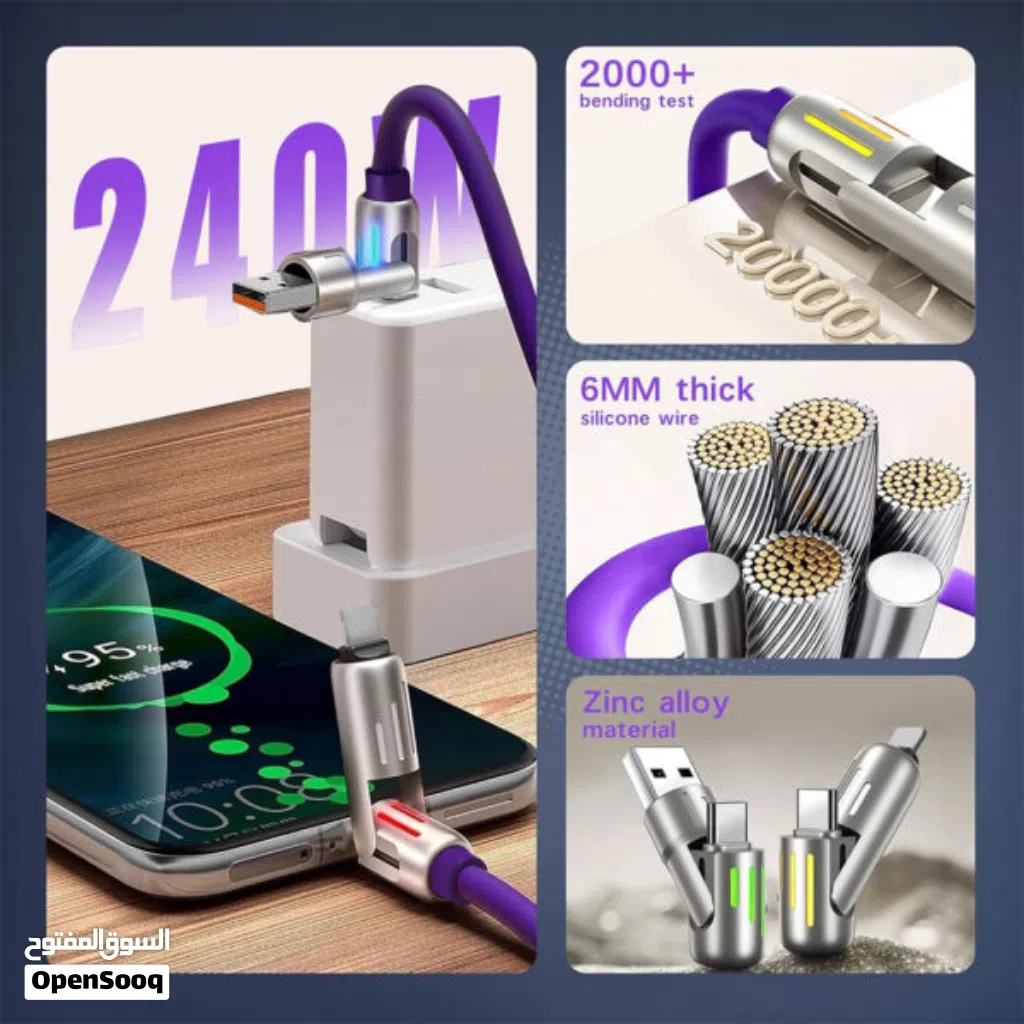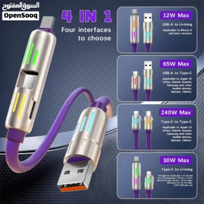 كابل شحن 4 في 1 متعدد الرؤوس (USB-C / USB-A / Lightning) بقدرة 240W