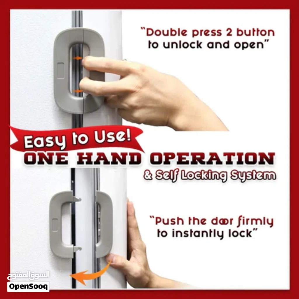 سهل التركيب! ليست هناك حاجة إلى أدوات أخرى. الصقه على جانب الباب وانقر فوق الزرين لفتحه. أغلق أي أبواب بأمان ، مثل الثلاجات والأدراج والخزائن وما إلى ذلك.